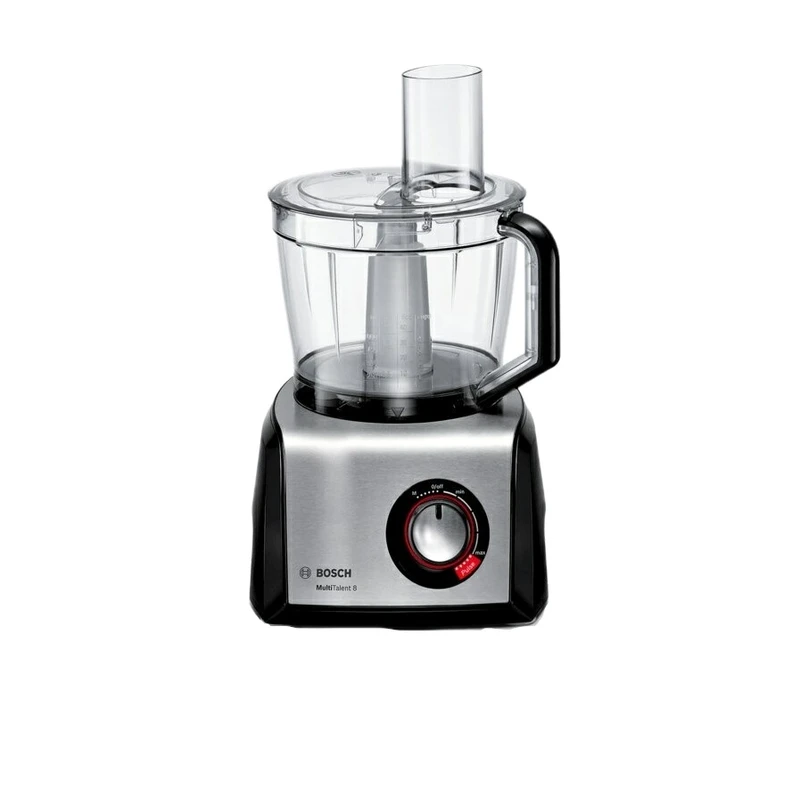 غذاساز بوش مدل MC812M865 با بدنهای از استیل ضدزنگ برسخورده و رنگ مشکی مات، ظاهری شیک و مدرن دارد که به زیبایی در هر آشپزخانهای جای میگیرد. ابعاد جمعوجور آن (۴۳×۲۵×۳۰ سانتیمتر) باعث میشود فضای زیادی اشغال نکند و بهراحتی در کابینت یا روی میز کار قرار گیرد.