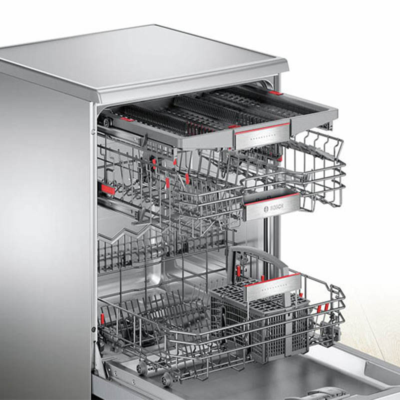 این ظرفشویی مجهز به 3 سبد شستشو است و ارتفاع بین آن ها دارای قابلیت تنظیم می باشد. جنس سبدهای این ظرفشویی همانند بدنه دستگاه از جنس استیل ضد زنگ می باشد و چون دائما با آب در ارتباط مستقیم می باشد به هیچ وجه زنگ نمی زند. سبد طبقه اول مخصوص قاشق و چنگال می باشد و در دو سبد دیگر می توانید بشقاب و حتی ماهی تابه و قابلمه قرار دهید.